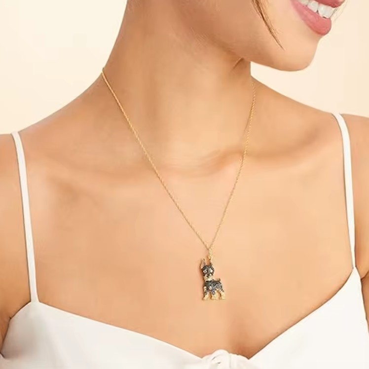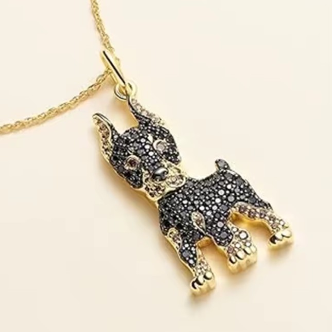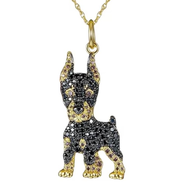 Elegantná retiazka s príveskom v tvare psa plemena doberman v zlatej farbe s malými krištálikmi. Rovnako ako tento milý psík, aj tento módny kúsok bude veselým doplnkom vášho štýlového šatníka. Radosť tak isto urobí ako darček pre každého milovníka tohto psieho plemena či mladú slečnu, ktorá zbožňuje psy.