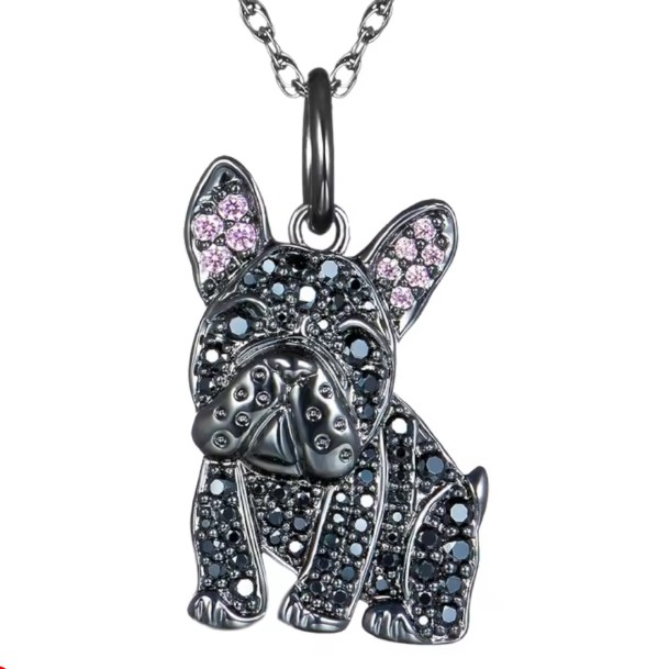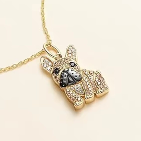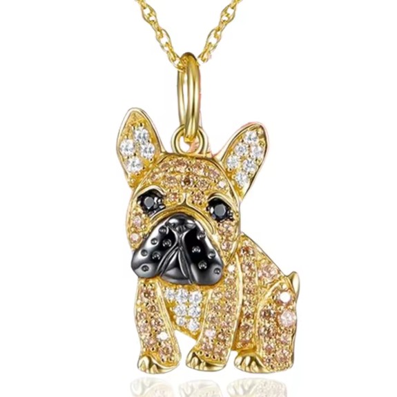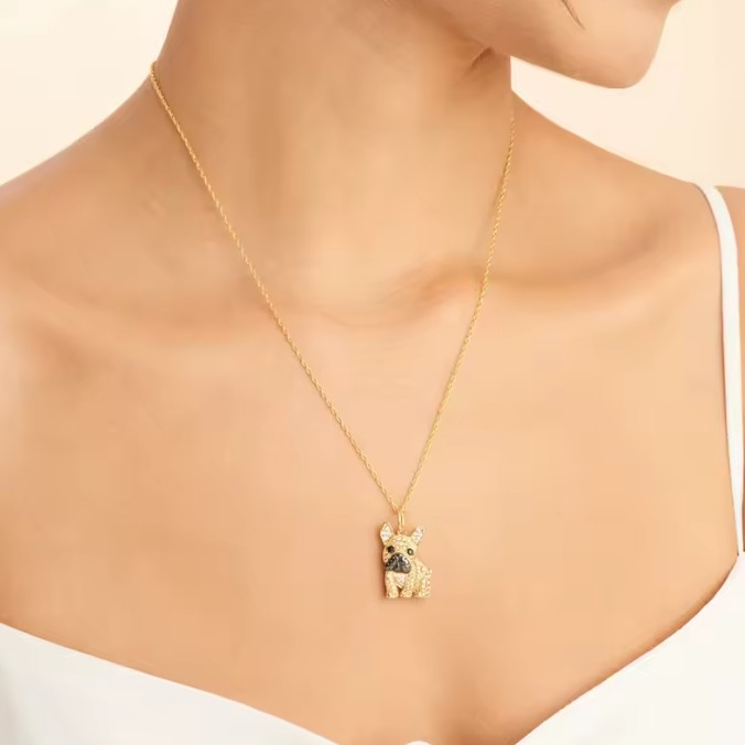 Elegantná retiazka s príveskom v tvare psa plemena francúzsky buldoček v zlatej farbe s malými krištálikmi. Rovnako ako tento milý psík, aj tento módny kúsok bude veselým doplnkom vášho štýlového šatníka. Radosť tak isto urobí ako darček pre každého milovníka tohto psieho plemena či mladú slečnu, ktorá zbožňuje psy.