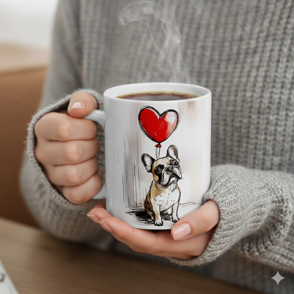 Začni deň s láskou, ktorá má štyri labky. Biely keramický hrnček s valentínskym motívom buldočka a srdiečkom poteší každého milovníka psov. Roztomilý dizajn zahreje pri srdci pri každom dúšku kávy či čaju a pripomenie, že najväčšia láska často čaká doma pri dverách.